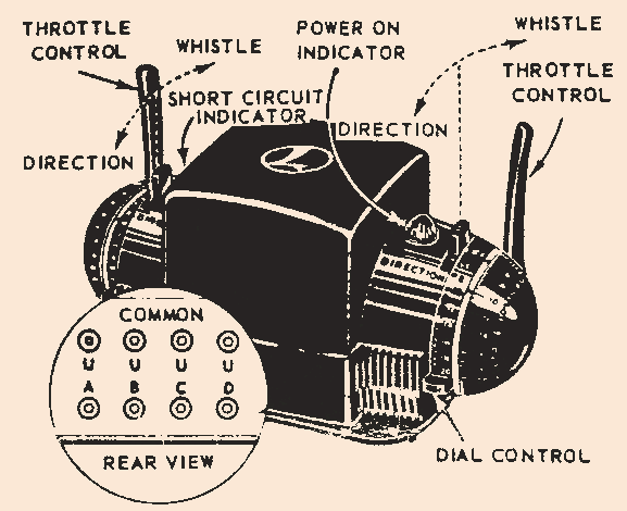 The two large handles on either side normally control your trains. The levers next to the throttle control the direction and the whistle. Push the lever forward to activate the whistle, and pull the lever back to interrupt power and change direction. Unlike the slightly smaller KW, the ZW can activate both whistles simultaneously if you wish.
