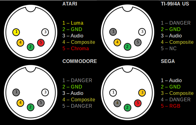 On US versions of the TI-99/4A, pin 3 at 3 o’clock outputs audio. Pin 5 is not connected. As usual, pin 2, at 6 o’clock, is ground. Pin 4, and 7 o’clock, is composite video, the same as Atari. Pin 1, at 9 o’clock, outputs 12 volts DC to power an RF modulator. Label this plug as dangerous on a TI.