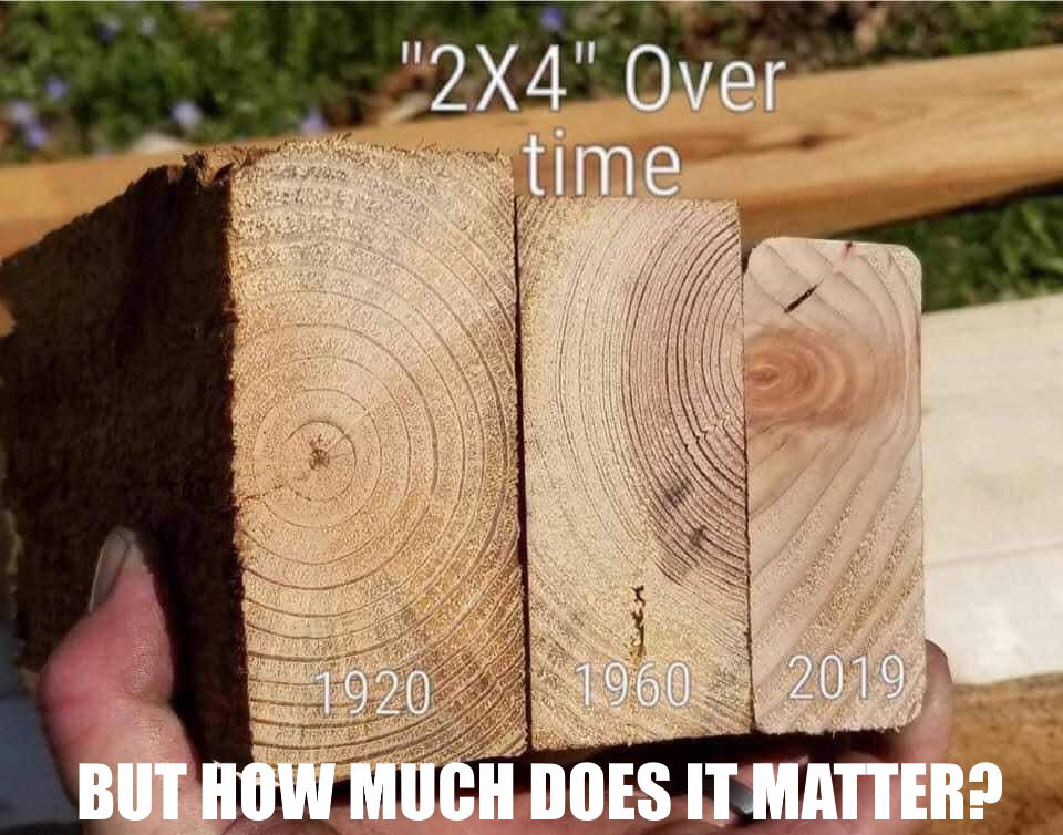 And in the end, how much weight a 2×4 from 1920 can hold compared to how much weight a 2×4 from 2020 can hold doesn’t matter as much as it seems. The softwood 2×4 of today is almost as good and costs less than half as much to produce. If it supports 25% less weight, we can simply add 25% more boards to make up the difference and come out ahead. This meme laments a problem that doesn’t really exist.